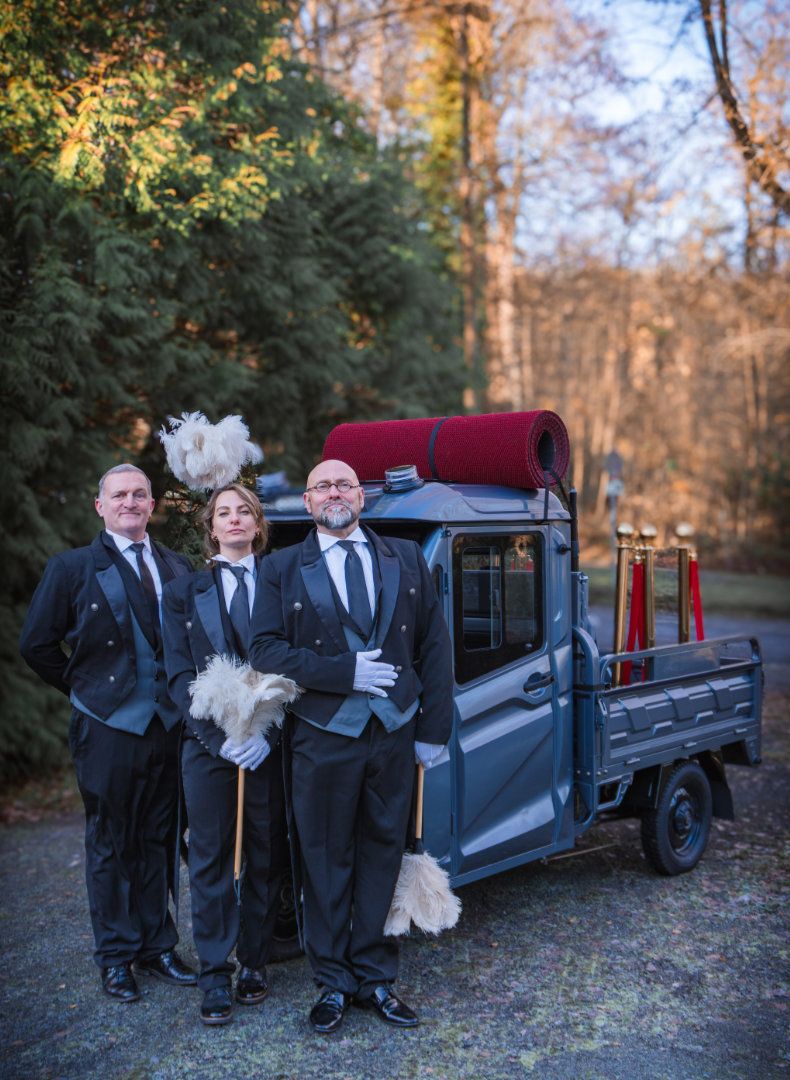 Mit ihrem mobilen Einsatzfahrzeug – dem Butlermobil – inklusive Mini-Bühne und PA-Anlage verwandeln sie jeden Ort in ein spontanes Theater, entschärfen Etikette-Notfälle und sorgen für absurde, unterhaltsame Dienstleistungen.